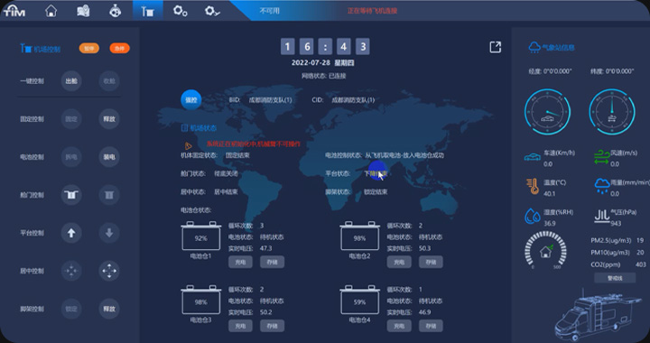 可实时监测无人机飞行状态(位置/电量/图传)、机场运行状态(舱门、电池、网络)及任务执行进度